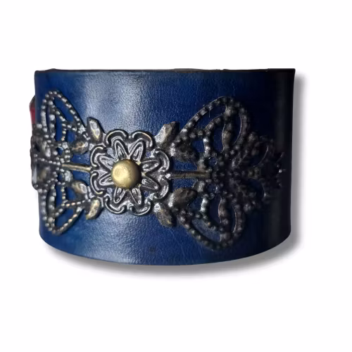 Armband, läder/marmorerat 349 kr Armbandet har ett innermått om ca 15-17 cm. I lager. Lägg i korgen Dela Lagersaldo: 1 Information Blåsvart marmorerat läderarmband med nitad tunn metalldekoration. Armbandet är ca 22 x 4 cm med två tryckknappar.