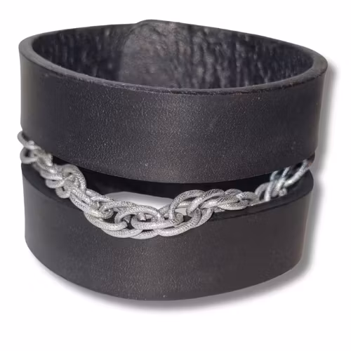 Armband, läder med kedja 399 kr Svart läderarmband med ett innermått om ca 16 cm. I lager. Lägg i korgen Dela Lagersaldo: 1 Information Laserskuret läderarmband med en kedja som dekoration. Armbandet är ca 21 x 4,5 cm med en tryckknapp.