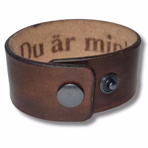 Armband, läder med hemlig text 499 kr Brunmelerat läderarmband med hemlig text "Du är min!" i. Armbandet har två tryckknappar och ett invändigt mått om ca16-18 cm. I lager. Lägg i korgen Dela Lagersaldo: 1 Information Armbandet mäter ca 22 x 3 cm.
