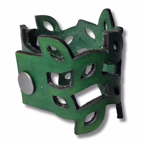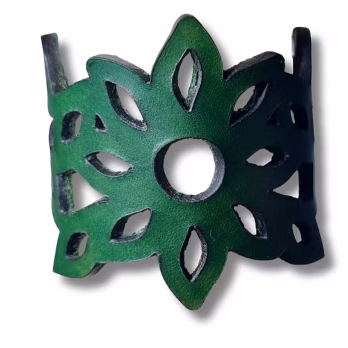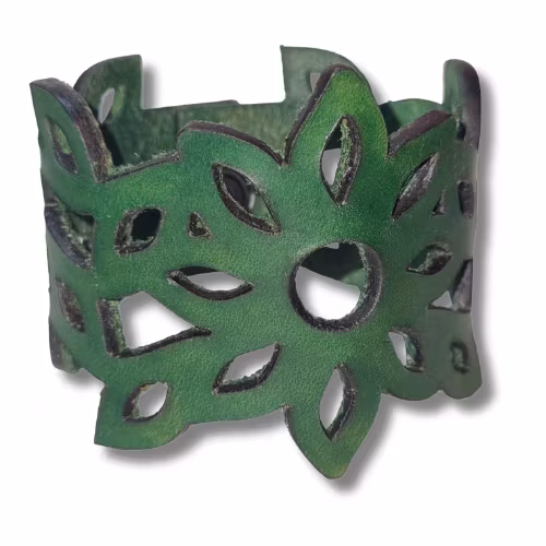 Armband, läder/blomma 499 kr Grönt läderarmband med en innerdiameter om ca 17 cm. I lager. Lägg i korgen Dela Lagersaldo: 1 Information Grönt läderarmband med utskuret mönster, blomma & blad.Armbandet är ca 20x6 cm