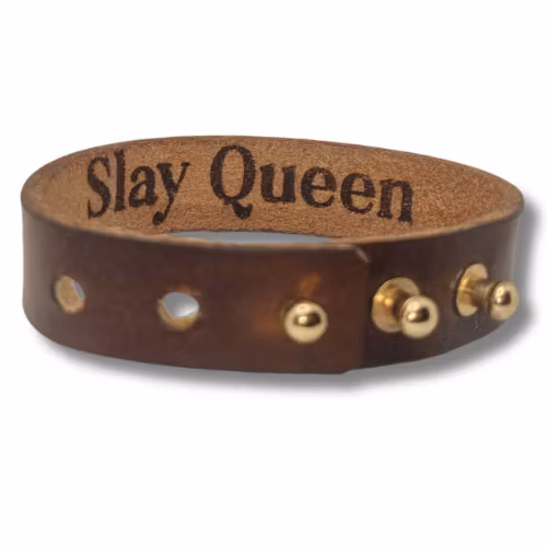 Armband, läder/brunt. Hemlig text "Slay Queen" inuti 399 kr Brunt läderarmband med ett innermått om ca 16-19 cm. Produkten är tyvärr slut i lager. :( Dela Information Brunt läderarmband som mäter ca 22 x 1,5 cm. Armbandet har tre guldfärgade gevärsknappar.