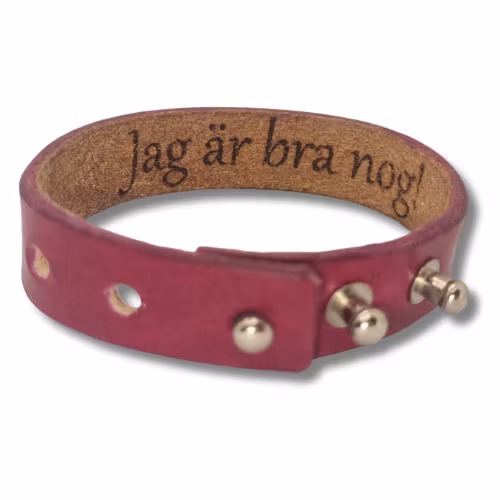 Armband, läder/cyklamen. Hemlig text "Jag är bra nog" inuti 399 kr Mörkrosa (cyklamen) läderarmband med ett innermått om ca 16-19 cm. I lager. Lägg i korgen Dela Lagersaldo: 1 Information Mörkrosa läderarmband som mäter ca 22 x 1,5 cm. Armbandet har tre silverfärgade gevärsknappar.