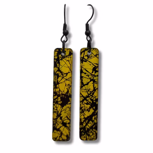 Örhängen, akryl/marmor, gul-svart 199 kr Mönstret är handgjort så alla örhängen ser lite olika ut. Svart baksida. I lager. Lägg i korgen Dela Lagersaldo: 2 Information Handmålade örhängen av akrylplast med svart fransk krok. Plattans storlek: B 1 cm, H 5 cm. Total längd ca 7,5 cm.