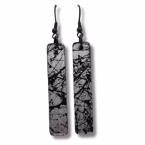 Örhängen, akryl/marmor, silver-svart 199 kr Mönstret är handgjort så alla örhängen ser lite olika ut. Svart baksida. I lager. Lägg i korgen Dela Lagersaldo: 1 Information Handmålade örhängen av akrylplast med svart fransk krok. Plattans storlek: B 1 cm, H 5 cm. Total längd ca 7,5 cm.