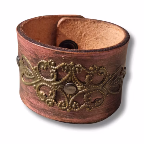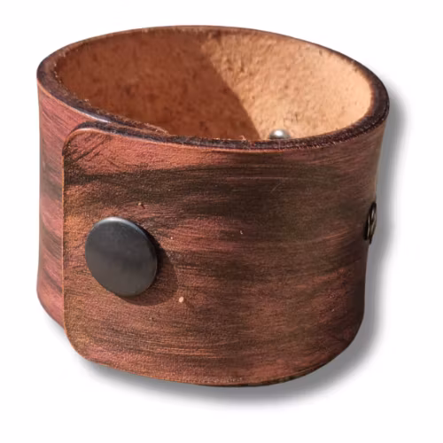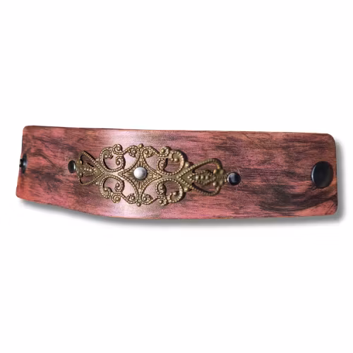 Tänk att få förvandla ett gammalt skärp till ett roligt armband. Något nytt, något gammalt, återbruk i dess bästa form. Det här armbandet är målat i svart-lila-rosa med en tunn metallapplikation.